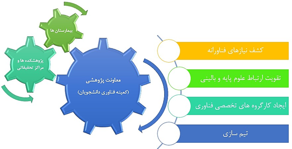 5.- شناسایی مسائل و نیازهای بیمارستان ها و مراکز درمانی و تیم سازی جهت حل مسئله در قالب هسته های فناورانه